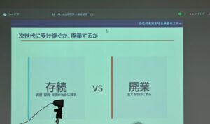 また、単なる制度説明や成功事例の紹介にとどまらず、参加者自身が自社の現状を振り返り、「いつ・誰に・どのように会社を引き継ぐのか」を考える視点を持つことを重視した構成としまいした。セミナーの後半では、参加者からの質疑応答の時間を設け、実際に直面している承継上の悩みや、家族・従業員との関係、将来への不安など、具体的なテーマについて意見交換を行いました。